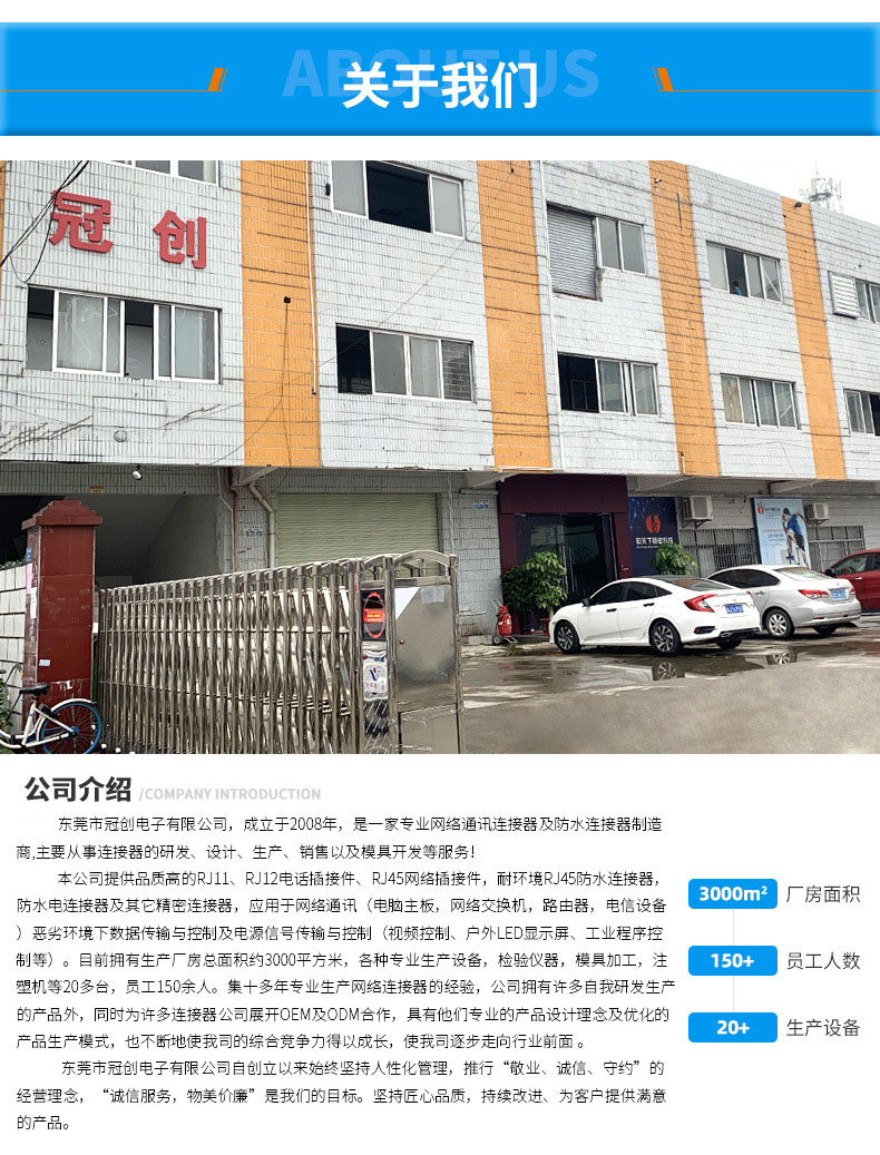 本公司提供優(yōu)良的RJ11、RJ12電話插接件、RJ45網(wǎng)絡(luò)插接件,耐環(huán)境RJ45防水連接器,防水電連接器及其它精密連接器,產(chǎn)品應(yīng)用于網(wǎng)絡(luò)通訊(電腦主板,網(wǎng)絡(luò)交換機,路由器,電信設(shè)備)、惡劣環(huán)境下數(shù)據(jù)傳輸與控制及電源信號傳輸與控制(戶外LED顯示屏、機器控制、工業(yè)程序控制等)